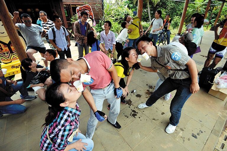 派选五名队员,在规定的一分钟时间内,完成“喝墨”+“翻杯子”挑战。如没有完成,排队继续挑战。任务完成,获得“东坡墨”一杯。