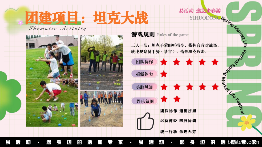 易活动的活动道具及设施始终如一地将安全保障放在各项工作的首位,所有户外活动均经过精心的设计与试验。任何的高空项目均安全带和保护绳加以保护,并由丰富经验的培训师严格地依照安全程序指导、监控活动的全过程;